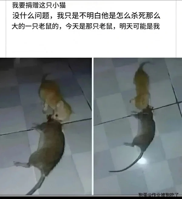 老鼠不管多大,看见猫就矮一头,哪怕一群看见一只猫,也是被猫一个人包围了,这真的是刻在dna里的恐惧,但也有极少数类似兔子蹬鹰的反杀案例