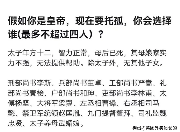 无害那档里,董仲颖占一个名额,毕竟兵部尚书真的不掌兵权。然后,手底下能选拔沙汰出这么多人才的皇帝,也不会让太监头子再进一步了。之后,应该是大将军梁冀,这货是靠着妹妹是皇后才按照汉朝传统惯例在父亲死后成为大将军的,所以按照题干,皇后已逝,外戚一系实力不强无法提供帮助,可以pass了,不过也给梁家留条血脉,遗诏去守陵吧。左右丞相,看起来是对地方豪强和经学士族的妥协,不可能托孤大臣里没有丞相这个百官之首(虽然现在有俩)。说起来,武媚娘是养母,这意味着成婚有子奶多可喂,托孤要给名分的,继续当奶妈吧。其他的都是完全体的老狐狸精,全是极品。这得什么档次的皇帝才能给自己宫内宫外凑出这么一大波能人狠人?